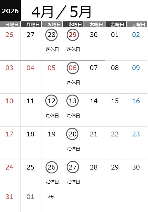 4月28日(火)、4月29日(水)は定休日のためお休みをいただきます。